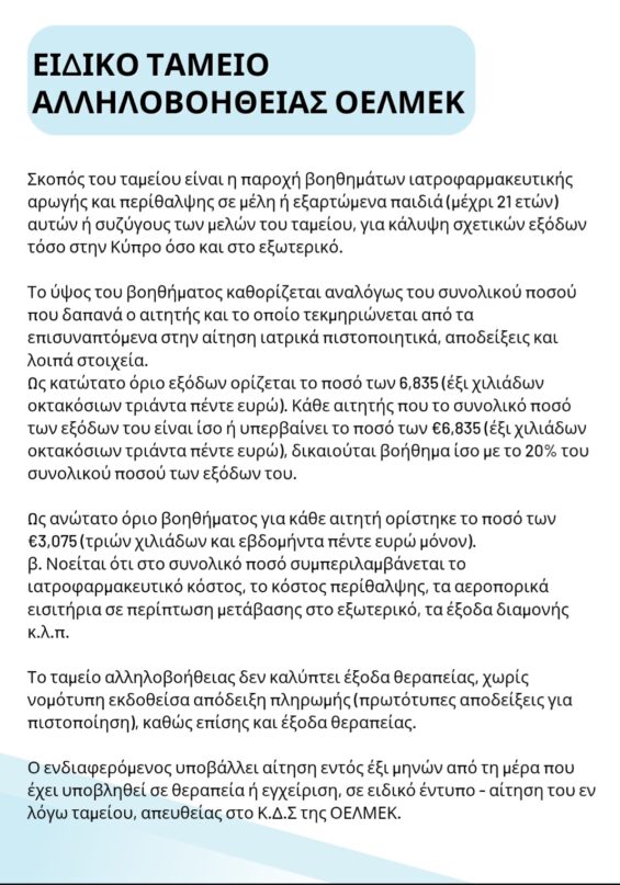 Αυτό αφορά κάλυψη μέρους εξόδων για ιατροφαρμακευτική περίθαλψη του μέλους ή των εξαρτώμενων παιδιών μέχρι την ηλικία των 21 ετών και του / της συζύγου.  Οι πόροι του ταμείου προέρχονται από έσοδα της ΟΕΛΜΕΚ και το ύψος του βοηθήματος μπορεί να φτάσει έως και τις €3.075, εφόσον τα έξοδα υπερβαίνουν τις €6.835.